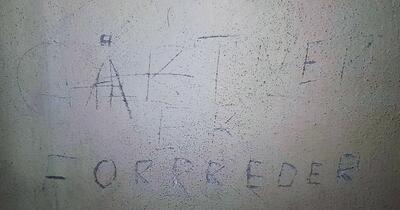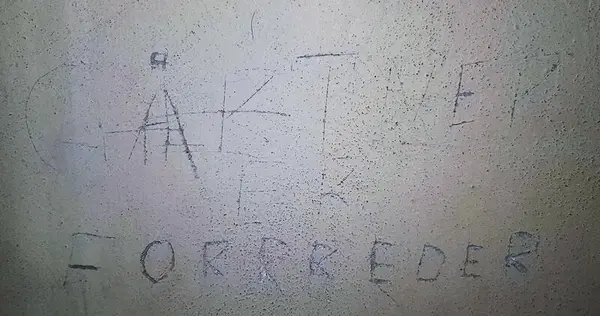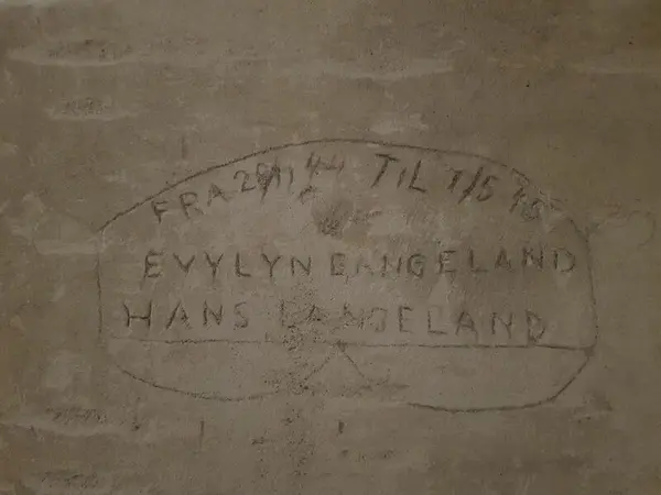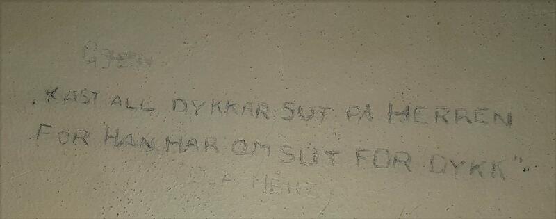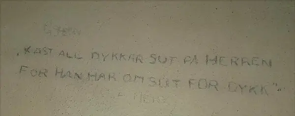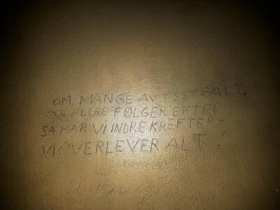 På veggene har fangene risset inn mer enn 218 innskrifter med dato, markering av antall dager, sitater, påkallelser, og symboler. Rissene stammer fra både krigsårene, og det påfølgende krigsoppgjøret. De er skrevet både på tysk og norsk.