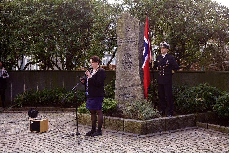 Daværende ordfører i Bergen Marte Mjøs Persen ved bautaen i 2016.