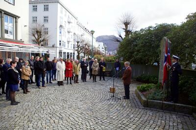 Årlig markering ved minnestøtten utenfor Gestapohuset. Arrangementet gjennomføres med æresvakt fra buekorpset Nordnæs Bataillon, og deltagere fra Forsvaret.