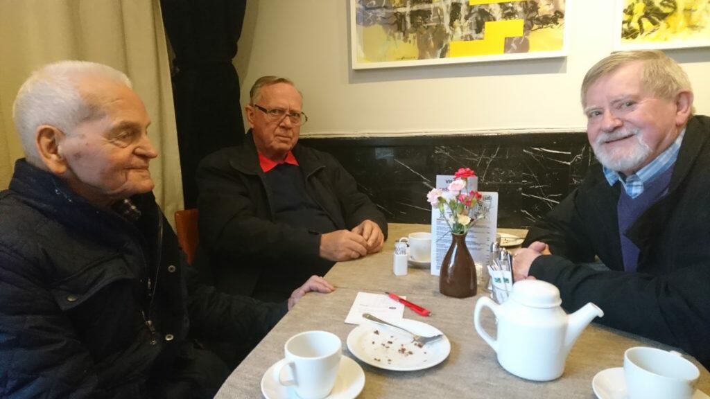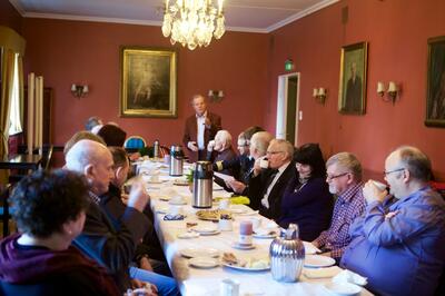 Etter markeringene arrangerer foreningen sosial sammenkomst for fremmøtte. Her ser vi tidsvitnet Norvald Bolstad. Styremedlemmene Terje Olsen og Helge Kaurin Nilsen er etterkommere etter arresterte motstandsfolk.