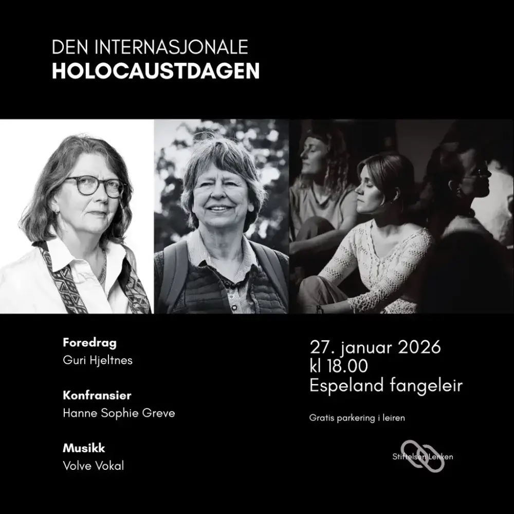 Den Internasjonale Holocaustdagen markeres som vanlig i Espeland fangeleir tirsdag 27. januar 2026. Vi får besøk av historiker Guri Hjeltnes og Hanne Sophie Greve. Kunstnerisk innslag ved koret Volve Vokal. Programmet er gratis og åpent for alle interesserte.