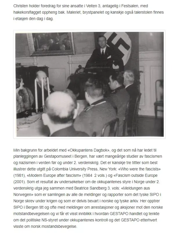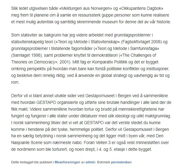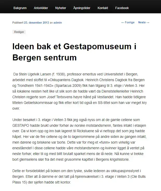 2013 Eldre innlegg Innlegget fortalte om hvordan foreningen hadde kommet i stand. Dette stod i sammenheng med utgivelsen av boken Okkupantens dagbok, som prof. Stein Ugelvik Larsen hadde gitt ut. <-- Se forrige innlegg 2013 Oversikt 2012-2022 Se innlegg 2014 --> Kommentarer til det du har lest?