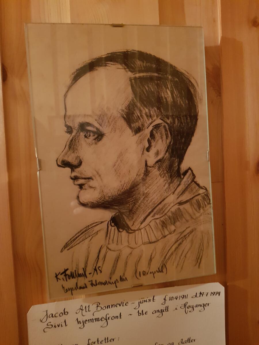 Den avbildede er Jacob A. Bonnevie som skal ha tilhørt sivil hjemmefront og angitt i Høyanger, arrestert og overført til Espeland fangeleir. Tegningen er datert 1945.