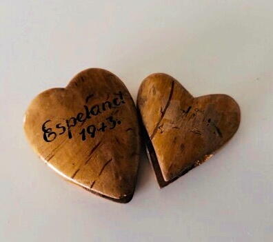 Det ene hjertet ble gitt av en fange til kjæresten på utsiden. Det andre beholdt han gjennom hele krigen, selv da han ble sendt til Tyskland. Hun beholdt også sitt hjerte, og da han returnerte hjem til Norge etter krigen ble de to gift.